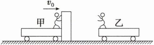 例5 如图所示,甲、乙两小孩各乘一辆冰车在光滑水平冰面上游戏,甲和他的冰车总质量为30kg,乙和他的冰车总质量也为30kg,游戏时甲推着一质量为10kg的木箱和他一起以$v_{0}=3.5m/s$的速度向右滑行,乙在甲的正前方静止在冰面上,为避免碰撞,甲将木箱推给乙,使木箱与乙一起运动,则甲至少以相对地面多大的速度将箱子推出才能避免与乙相撞?