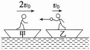 针对练2. 如图所示,甲、乙两船的总质量(包括船、人和货物)分别为10m、12m,两船沿同一直线同一方向运动,速度分别为$2v_{0}$、$v_{0}$。为避免两船相撞,乙船上的人将一质量为m的货物沿水平方向抛向甲船,甲船上的人将货物接住,则乙船上的人抛出货物的最小速度大小(不计水的阻力)为( )