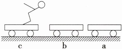 针对练1.AD a、b、c、小孩组成的系统,水平方向所受的外力为零,水平方向动量守恒,故A正确;小孩跳离c车的过程,取水平向右为正方向,对小孩和c组成的系统,由水平方向动量守恒,有0=mv+MvC,解得c车的速度$vC=-\frac{m}{M}v,$负号表示方向向左,小孩跳上b车再跳离b车的过程,对小孩和b组成的系统,由水平方向动量守恒,有mv+0=Mvb+mv,解得b车最终的速度vb=0,故B、C错误;小孩跳上a车的过程,由水平方向动量守恒,有mv+0=(M+m)va,解得a车的最终速度$va=\frac{m}{m+M}v,$故D正确。故选AD。