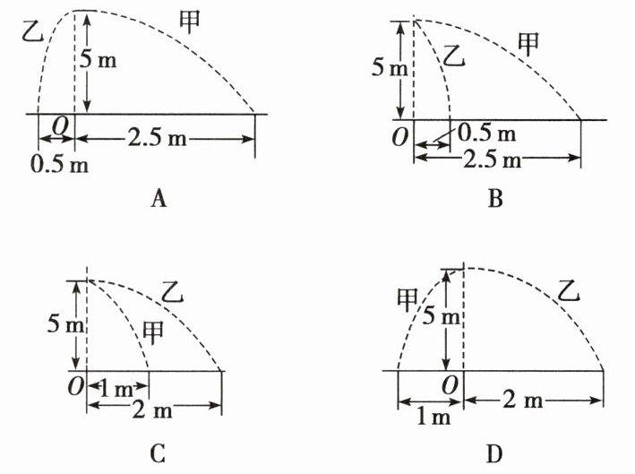 针对练 2. 一弹丸在飞行到距离地面 $ 5 \, m $ 高时仅有水平速度 $ v_0 = 2 \, m/s $,爆炸成甲、乙两块水平飞出,甲、乙的质量比为 $ 3:1 $,不计质量损失,重力加速度 $ g $ 取 $ 10 \, m/s^2 $,则下列图中两块弹片飞行的轨迹可能正确的是( )