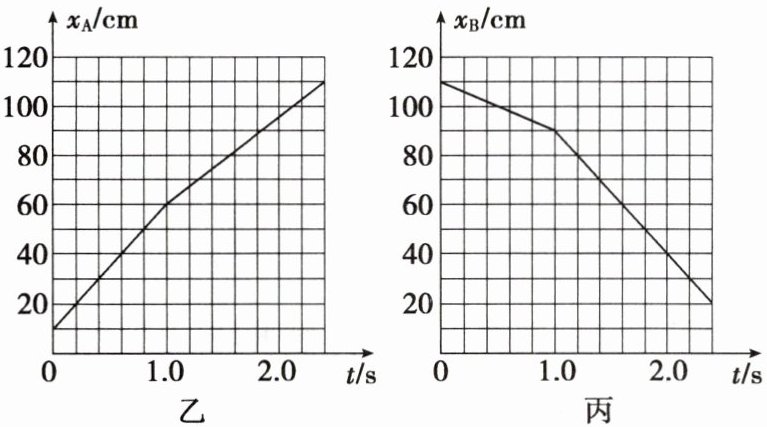 ④导出传感器记录的数据,绘制 $ x_{A} $、$ x_{B} $ 随时间变化的图像,分别如图乙、图丙所示。