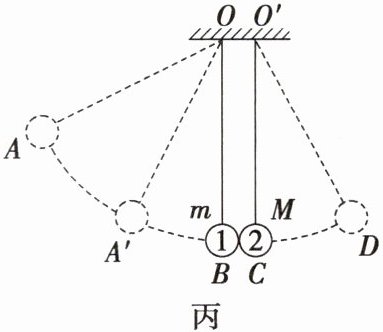 (3)受上述实验的启发,某同学设计了另一种验证动量守恒定律的实验方案。如图丙所示,用两根不可伸长的等长轻绳将两个半径相同、质量不等的匀质小球悬挂于等高的 $ O $ 点和 $ O' $ 点,两点间距等于小球的直径。将质量较小的小球 1 向左拉起至 $ A $ 点由静止释放,在最低点 $ B $ 与静止于 $ C $ 点的小球 2 发生正碰。碰后小球 1 向左反弹至最高点 $ A' $,小球 2 向右摆动至最高点 $ D $。测得小球 1、2 的质量分别为 $ m $ 和 $ M $,弦长 $ AB = l_{1} $、$ A'B = l_{2} $、$ CD = l_{3} $。