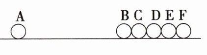 针对练 1. 如图所示,5 个小球 B、C、D、E、F 并排放置在光滑的水平面上,B、C、D、E 四个小球质量相等,而 F 球质量小于 B 球质量,A 球的质量等于 F 球质量,A 球以速度 $ v_0 $ 向 B 球运动,所发生的碰撞均为弹性正碰,则碰撞之后( )