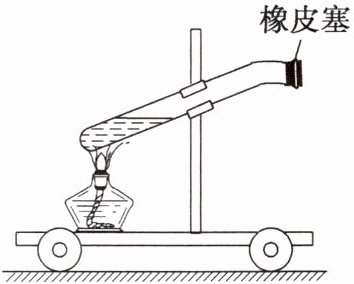 如图所示,反冲小车(含酒精灯、铁架台、带有橡皮塞盛水的玻璃管)静止在水平光滑玻璃地板上,点燃酒精灯对玻璃管内的水加热,到一定程度时管内水蒸气将橡皮塞水平喷出,小车沿相反方向运动。如果小车运动前的总质量 $ M = 3 \, kg $,水平喷出的橡皮塞的质量 $ m = 0.1 \, kg $。(水蒸气质量忽略不计)