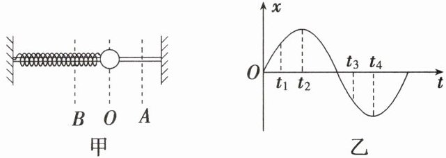 AC 振子在A点和B点时位移最大,由于取向右为正方向,所以振子运动到A点有正向最大位移,运动到B点有负向最大位移,则t₂时刻振子在A点,t₄时刻振子在B点,故A正确,B错误;振子的位移以平衡位置为初位置,所以在t₁~t₂和t₃~t₄时间内振子的位移都在增大,故C正确,D错误。故选AC。