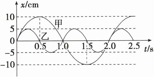B.甲、乙两弹簧振子在 $ 10 \, s $ 内质点经过的路程之比是 $ 1 : 1 $