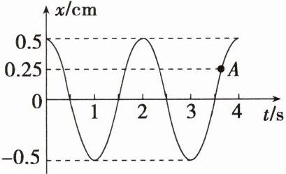 C 在题图中的A点,其位移$x = 0.25\ cm$,故此时弹力$F = kx = 20 × 0.25\ N = 5\ N$,其位置在$x$轴的正半轴,故受力方向指向$x$轴负方向,故A正确;在A点,振子正在向$x$轴正方向运动,故B正确;由题图可知周期$T = 2\ s$,故振子在$4\ s$内做了$2$次全振动,故C错误;由于$4\ s = 2T$,故振子通过的路程为$2 × 4 × 0.5\ cm = 4\ cm$,故D正确。故选C。
