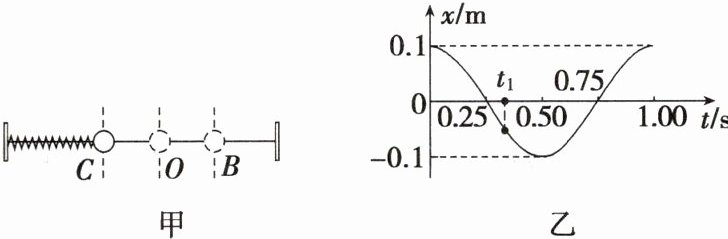 C 弹簧振子从B点经过O点再运动到C点为$\frac{1}{2}$次全振动,A错误;根据题图乙可知,弹簧振子的振幅$A = 0.1\ m$,周期$T = 1\ s$,则$\omega = \frac{2\pi}{T} = 2\pi\ rad/s$,水平向右为正方向,$t = 0$时刻位移为$0.1\ m$,表示振子从B点开始运动,初相$\varphi_0 = \frac{\pi}{2}$,则振子的振动方程为$x = A\sin(\omega t + \varphi_0) = 0.1\sin(2\pi t + \frac{\pi}{2})\ m$,B错误;因周期$T = 1\ s$,则$2.5\ s = 2.5T$,则振子在前$2.5\ s$内通过的路程$s = 2.5 × 4A = 10 × 0.1\ m = 1\ m$,C正确;题图乙中的$t_1$时刻振子的速度方向为负,做减速运动,即从O向C运动,加速度方向为正,D错误。故选C。