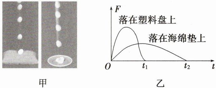 【师生互动】如图甲所示,让两个鸡蛋从相同高处同时自由落下,分别落在海绵垫上和塑料盘中,用力的传感器记录了所受弹力随时间变化的 $ F - t $ 图像,如图乙所示,发现两条 $ F - t $ 图线与 $ t $ 轴围成的图形的面积近似相等。