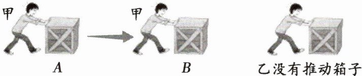 【情境导入】如图所示,甲、乙两人分别用同样的力 $ F $ 推放在水平地面上的箱子,同样的时间 $ t $ 内甲将箱子从 $ A $ 点推到 $ B $ 点,乙推的箱子静止不动。