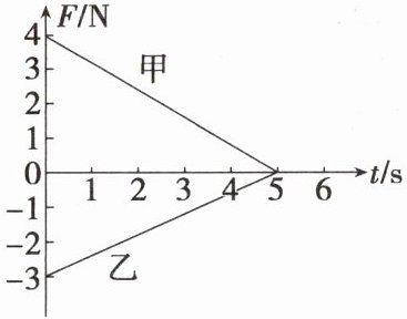 AD 根据F-t图像中图线与t轴围成的面积表示对应时间内的冲量,可知0~5 s内,甲力对物体的冲量I_甲$=\frac{1}{2}×4×5 N·s=10 N·s,$乙力对物体的冲量I_乙$=\frac{1}{2}×(-3)×5 N·s=-7.5 N·s,$故A正确,B错误;0~5 s内,甲、乙两个力对物体总冲量为I_甲+I_乙=2.5 N·s,故C错误,D正确。故选AD。