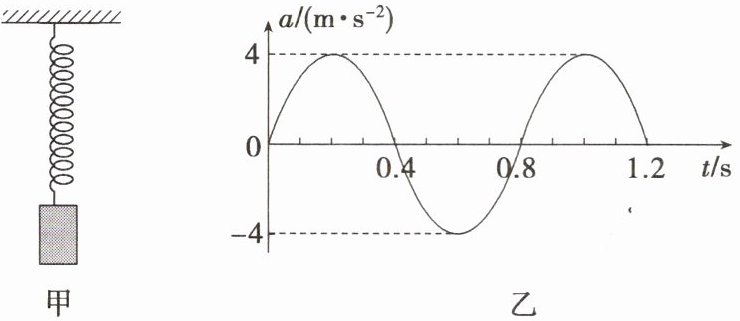 真题2 (2024·北京高考·T9)图甲为用手机和轻弹簧制作的一个振动装置。手机加速度传感器记录了手机在竖直方向的振动情况,以向上为正方向,得到手机振动过程中加速度$a$随时间$t$变化的曲线为正弦曲线,如图乙所示。下列说法正确的是( )