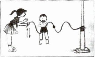 【师生互动】如图所示,绳的一端固定在竖直杆上,在绳上做个标记,用手握住另一端拉