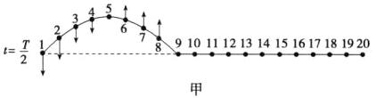 解析:各质点在$t = \frac{T}{2}$、$t = \frac{3T}{4}$的情况,分别如图甲、乙所示。