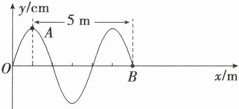 【师生互动】某波源完成一次全振动的时间为 $ 2 \, s $,如图为其在空气中的某一时刻的波形图,介质中 $ A $、$ B $ 两质点平衡位置之间的距离为 $ 5 \, m $。
