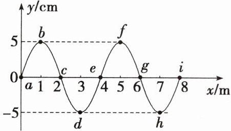 (2)该时刻质点 $ b $ 的平衡位置与 $ f $ 的平衡位置间、$ d $ 的平衡位置与 $ h $ 的平衡位置间、$ c $ 与 $ g $ 间的距离有什么关系?这个距离有何意义?