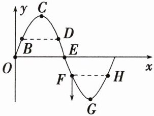 CD 由“上下坡”法可知,波向左传播,质点D的运动方向向下,而质点O、B、H的运动方向向上,质点F、H相对各自平衡位置的位移相同,由$a=-\frac{kx}{m}$可知,两质点的加速度相同,因质点C直接从最大位移处回到平衡位置,即$t_C=\frac{T}{4}$,而质点B要先运动到最大位移处,再回到平衡位置,故$t_B>\frac{T}{4}=t_C$。故选CD。