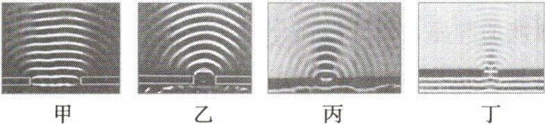 【师生互动】利用盛有一定深度的水的发波水槽观察水波衍射实验时,分别拍摄了以下四幅照片。已知甲、乙图中水波的波长相同,狭缝的宽度不同;丙、丁图中狭缝的宽度相同,丙图中水波的波长是丁图中的$\frac{7}{5}$。