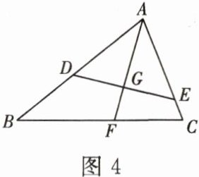题系 2 - 3 如图 4,在 $\triangle ABC$ 中,$D$,$E$ 分别是 $AB$,$AC$ 上的点,$\angle AED = \angle B$,$AD = 2$,$AC = 3$,$\triangle ABC$ 的角平分线 $AF$ 交 $DE$ 于点 $G$,交 $BC$ 于点 $F$。