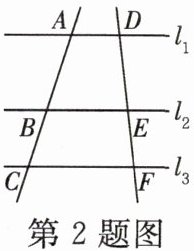 2. [浙教九上 P126T1 改编]如图,直线 $l_1 // l_2 // l_3$,直线 $AC$ 交 $l_1$,$l_2$,$l_3$ 于点 $A$,$B$,$C$;直线 $DF$ 交 $l_1$,$l_2$,$l_3$ 于点 $D$,$E$,$F$。已知 $\frac{AB}{BC}=\frac{4}{3}$,则 $\frac{DE}{DF}=$
