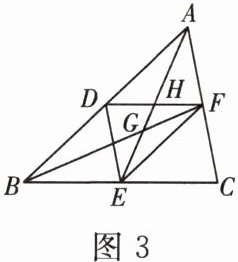 题系 2 - 2 如图 3,在 $\triangle ABC$ 中,$D$,$E$,$F$ 分别是 $AB$,$BC$,$CA$ 的中点,则图中与 $\triangle ABC$ 相似的有 ,$\triangle DEF$ 与 $\triangle CAB$ 的周长比为 ,面积比为 ;若 $AE$ 与 $BF$ 相交于点 $G$,与 $DF$ 相交于点 $H$,则点 $G$ 是 $\triangle ABC$ 的 ,$AG:GE =$ ;$AH:HG =$ 。