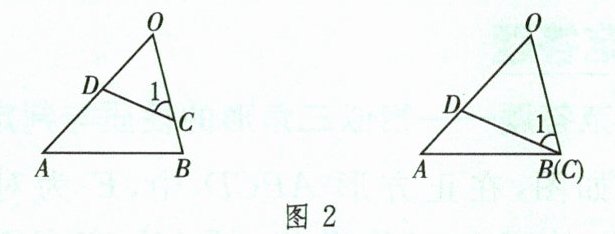 (2)斜线型:如图 2,若 $\angle 1 = \angle A$,则有 $\triangle OCD \backsim \triangle OAB$。特别地,右图中,当 $\triangle OCD \backsim \triangle OAB$ 时,有 $OC^2 = OA · OD$。
