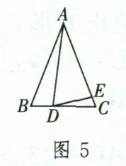 ②如图 5,若 $\angle B = \angle ADE = \angle C$,则 $\triangle ABD \backsim \triangle DCE$。
