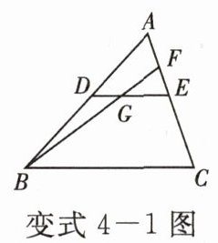变式 4 - 1 [平行线型][2025·钱塘区模拟]如图,在 $\triangle ABC$ 中,$D$,$E$ 分别是 $AB$,$AC$ 的中点,$F$ 是 $AE$ 的中点,连结 $DE$,$BF$,两者相交于点 $G$。若 $EG = 6$,则 $DG =$ 。