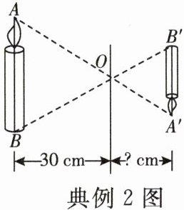 [跨学科]物理课上学过小孔成像的原理,它是一种利用光的直线传播特性实现图像投影的方法. 如图,燃烧的蜡烛(竖直放置)AB 经小孔 O 在屏幕(竖直放置)上成像 A'B',设 AB = 36 cm,A'B' = 24 cm,小孔 O 到 AB 的距离为 30 cm,则小孔 O 到 A'B'的距离为