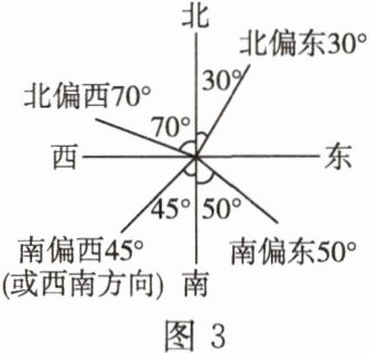 如图 $3$,指北或指南的方向线与目标方向线所成的小于 $90^{\circ}$ 的角叫做方向角。