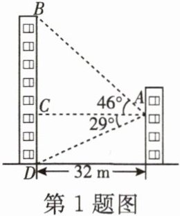 1. [浙教九下 P25T2 改编]小玲家对面新造了一幢图书大厦,小玲在自家窗口测得大厦顶部的仰角和大厦底部的俯角(如图所示),量得两幢楼之间的距离为 $32$ m,则大厦的高约为