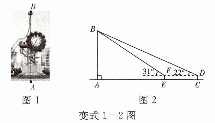 变式 1 - 2 [2025·天津]在综合与实践活动中,要用测角仪测量天津站附近世纪钟建筑 $AB$ 的高度(如图 $1$)。某学习小组设计了一个方案:如图 $2$,点 $A$,$E$,$C$ 依次在同一条水平直线上,$CD \perp AC$,$EF \perp AC$,且 $CD = EF = 1.7$ m。在 $D$ 处测得世纪钟建筑顶部 $B$ 的仰角为 $22^{\circ}$,在 $F$ 处测得世纪钟建筑顶部 $B$ 的仰角为 $31^{\circ}$,$CE = 32$ m。根据该学习小组测得的数据,计算世纪钟建筑 $AB$ 的高度(结果取整数,参考数据:$\tan 22^{\circ} \approx 0.4$,$\tan 31^{\circ} \approx 0.6$)。