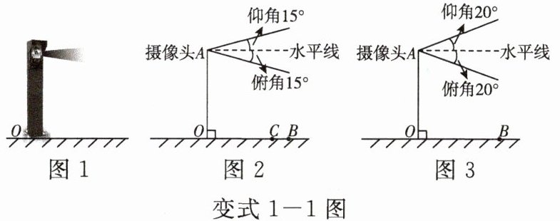 变式 1 - 1 [2023·嘉兴·舟山]图 $1$ 是某住宅单元楼的人脸识别系统(整个头都需在摄像头视角范围内才能被识别),其示意图如图 $2$,摄像头 $A$ 的仰角、俯角均为 $15^{\circ}$,摄像头高度 $OA = 160$ cm,识别的最远水平距离 $OB = 150$ cm。(精确到 $0.1$ cm,参考数据:$\sin 15^{\circ} \approx 0.26$,$\cos 15^{\circ} \approx 0.97$,$\tan 15^{\circ} \approx 0.27$,$\sin 20^{\circ} \approx 0.34$,$\cos 20^{\circ} \approx 0.94$,$\tan 20^{\circ} \approx 0.36$)
