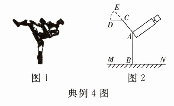 典例 4 [新情境][2025·嵊州模拟]如图 $1$ 是某科技公司机器人“G1”在展示中国功夫时的精彩瞬间,图 $2$ 是该瞬间的几何示意图,机器人的一条腿 $AB$ 直立于地面 $MN$,另一条腿的大腿部分 $AC$ 与 $AB$ 所成的角度为 $140^{\circ}$,小腿部分 $CD$ 刚好平行于地面 $MN$(即 $AB \perp MN$ 于点 $B$,$\angle CAB = 140^{\circ}$,$CD // MN$)。已知 $AB = 60$ cm,$AC = 35$ cm,$CD = 25$ cm。$CE$ 是机器人“G1”小腿 $CD$ 上踢后与大腿 $AC$ 在同一直线的瞬间(这里的小腿 $CD$,$CE$ 都包括脚面部分)。求: