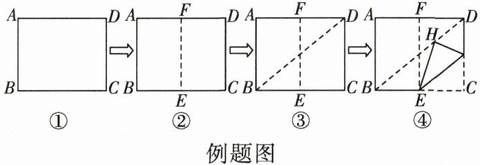 第一步,将图形①中的纸片对折,使 $ AB $ 与 $ DC $ 重合,折痕为 $ EF $,展开后如图形②;