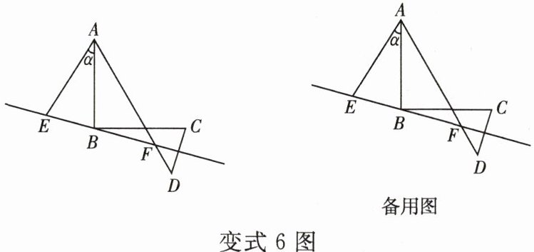 变式 6 如图,已知 $ \angle ABC = 90^{\circ} $,$ AB = BC $,将线段 $ AB $ 绕着点 $ A $ 顺时针旋转 $ \angle \alpha (0^{\circ} < \angle \alpha < 90^{\circ}) $ 得到线段 $ AE $,作点 $ C $ 关于直线 $ BE $ 的对称点 $ D $,连结 $ AD $ 交直线 $ BE $ 于点 $ F $.