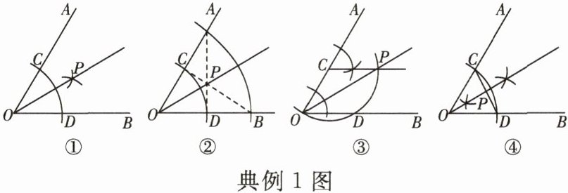 典例 1 某班开展“用直尺和圆规作角平分线”的探究活动,各组展示作图痕迹如下,其中射线 OP 为∠AOB 的平分线的有(