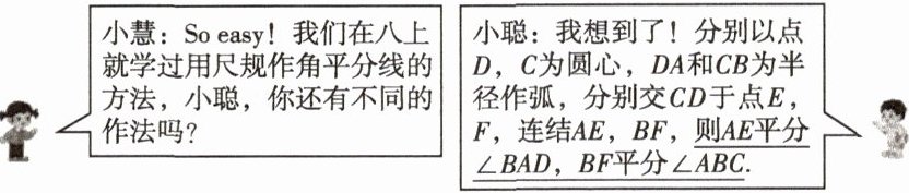 变式 3 - 3 [2025·衢州模拟]尺规作图起源于古希腊的数学课题,指仅使用圆规和无刻度的直尺作图.如图 1,在四边形 ABCD 中,AB > AD,AB//CD,要求用尺规作∠DAB,∠ABC 的角平分线.下面是两位同学的对话:
