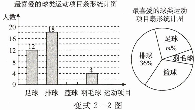 [2025·齐齐哈尔]国家卫生健康委员会宣布将 2025 年定为“体重管理年”,并实施为期三年的体重管理行动.某校响应号召,计划组织全校学生开展系列体育活动,筹备足球、排球、篮球、羽毛球四个球类运动的体育社团,倡导学生全员参加.为了解学生对这四项球类运动的喜爱情况,随机抽取部分学生,对其进行了“我最喜爱的球类运动项目”问卷调查(每名学生在这四项球类运动项目中选择一项),将这部分学生的问卷进行整理,依据样本数据绘制了如下两幅不完整的统计图.