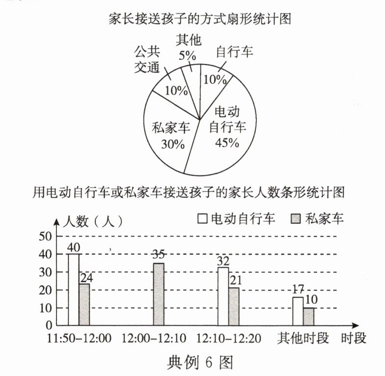 [2025·山西]近年来,交通工具的多样化和普及化,为家长接送孩子带来便利的同时,也在一定程度上造成了放学时段校门口的交通拥堵.为了解具体情况,某校爱心社团中午放学后在校门口随机选取 300 名接送孩子的家长,针对接送孩子的方式和时段进行了问卷调查,所有问卷全部收回且有效,并将调查结果绘制成了如下所示的扇形统计图和条形统计图(不完整).