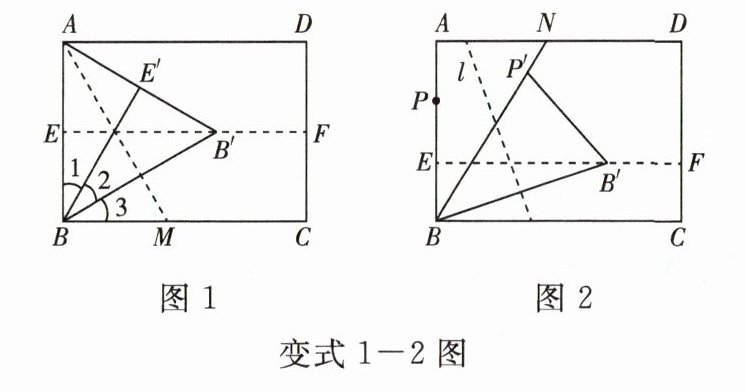 【类比操作】如图2,$N$ 为矩形纸片 $ABCD$ 的边 $AD$ 上的一点,连结 $BN$,在 $AB$ 上取一点 $P$,折叠纸片,使 $B$,$P$ 两点重合,展平纸片,得到折痕 $EF$;折叠纸片,使点 $B$,$P$ 分别落在 $EF$,$BN$ 上,得到折痕 $l$,点 $B$,$P$ 的对应点分别为 $B'$,$P'$,展平纸片,连结 $BB'$,$P'B'$。