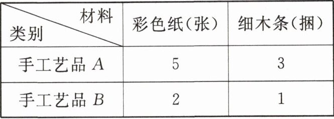 典例 6 [2025·浙江]手工社团的同学制作两种手工艺品 $ A $ 和 $ B $,需要用到彩色纸和细木条,单个手工艺品材料用量如下表。
