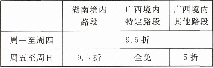 变式 6 [2025·广西]自 2025 年 5 月 9 日起至 2025 年 12 月 31 日,周末自驾游广西的外省籍小客车,可享受高速公路车辆通行费(以下简称高速费)优惠。小悦一家 5 月中旬从湖南自驾到广西探亲游玩,此次全程所产生的高速费享受的优惠如下: