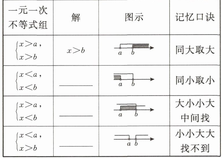 (3) 不等式组的解可分为下表的四种情形(假设$a < b$):