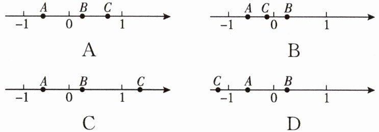 变式 3-2 [2023·杭州]已知数轴上的点 A,B 分别表示数$a$,$b$,其中$-1 < a < 0$,$0 < b < 1$.若$a × b = c$,数$c$在数轴上用点 C 表示,则点 A,B,C 在数轴上的位置可能是 (