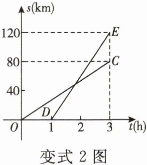 变式 2 [2025·湖州模拟]已知甲、乙两地相距 $ 120 $ km,小明、小红两人分别开车沿同一条公路从甲地出发到乙地,如图,线段 $ DE $,线段 $ OC $ 分别表示小明、小红离开甲地的路程 $ s $(km)与时间 $ t $(h)的函数关系的图象,根据图象解答下列问题: