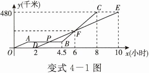 变式 4 - 1 [2025·杭州校级模拟]甲、乙两车从 $ M $ 地到距离 $ 480 $ 千米的 $ N $ 地,甲车比乙车晚出发 $ 2 $ 小时,乙车途中因故停车检修,图中线段 $ DE $、折线 $ OABC $ 分别表示甲、乙两车所行路程 $ y $(千米)关于时间 $ x $(小时)的函数图象.