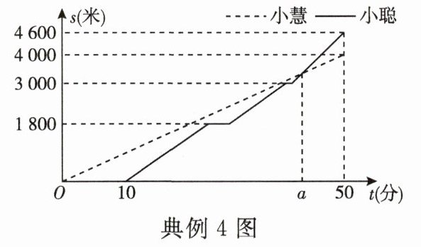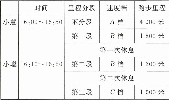 典例 4 [2024·浙江]某日下午,小慧在跑步机上慢跑锻炼. $ 10 $ 分钟后小聪也在同型号的另一台跑步机上跑步,小聪跑步时中间休息了两次. 跑步机上跑步速度有多档可选,其中 $ C $ 档速度比 $ B $ 档速度快 $ 40 $ 米/分,$ B $ 档速度比 $ A $ 档速度快 $ 40 $ 米/分. 小慧与小聪跑步的相关信息如下表所示,跑步累计里程 $ s $(米)与小慧跑步时间 $ t $(分)的函数关系如图所示.