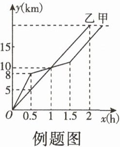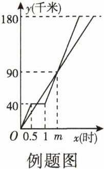 例题 (10 分)现有甲、乙两辆旅游车同时从旅行社前往某个旅游景点,全程 $ 180 $ 千米. 行驶过程中甲车因故停留一段时间后继续驶向景点,乙车全程以 $ 60 $ 千米/时的速度驶向景点. 两辆车的行驶路程 $ y $(千米)关于行驶时间 $ x $(时)的函数关系如图所示.