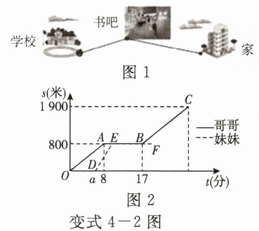 变式 4 - 2 [2023·金华]兄妹俩放学后沿图 1 中的马路从学校出发,到书吧看书后回家. 哥哥步行先出发,途中速度保持不变;妹妹骑车,到书吧前的速度为 $ 200 $ 米/分. 图 2 中的图象分别表示两人离学校的路程 $ s $(米)与哥哥离开学校的时间 $ t $(分)的函数关系.